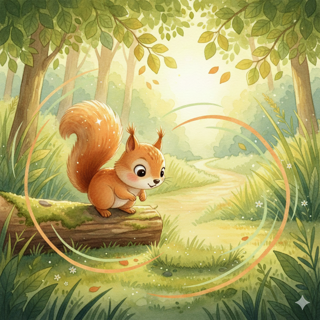 다람이는 반짝이는 ‘ㄹ’이 가리키는 방향으로 발걸음을 옮겼어요. 숲길은 부드럽게 굽어 있었고, 바람은 귀를 간질이며 르르르— 손짓하듯 다람이를 안내했죠.